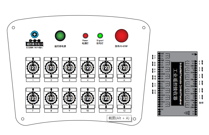 布局配置:12个三位自复位拨杆+2个指示灯+充电孔+启动和急停蘑菇头;