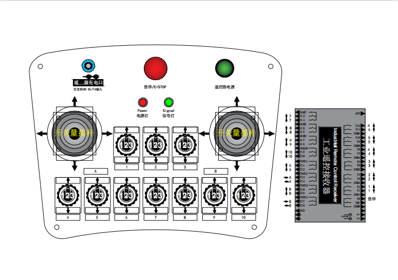 布局配置:3个四方向开关量自复位摇杆,10个三位自复位拨杆,, 2个指示灯,充电孔,及启动和急停蘑菇头;