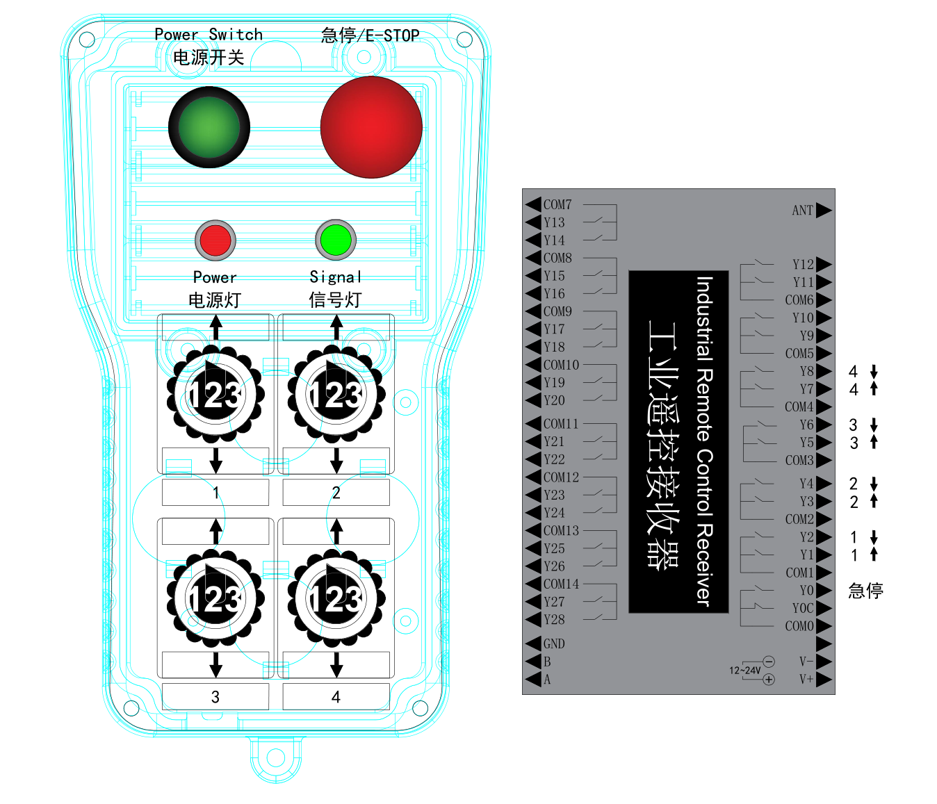 本机型产品型号DSD-8BZ(ACDC12-24V/空旷环境100米/1发1收/开关量16路+急停1路/),,其他电压如AC220V或AC380V等则通过外置变压器转压适配!